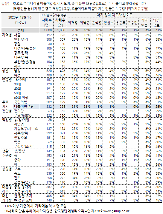 한국갤럽이 2020년 12월 첫째 주(1~3일) 전국 만 18세 이상 1,000명에게 앞으로 우리나라를 이끌어갈 정치 지도자, 즉 다음번 대통령감으로 누가 좋다고 생각하는지 물은 결과(자유응답) 이재명 경기도지사가 20%로 1위, 이낙연 더불어민주당 대표가 16%로 2위, 윤석열 검찰총장이 13%로 3위를 기록해 3강구도가 유지되고 있는 것으로 조사됐다.
