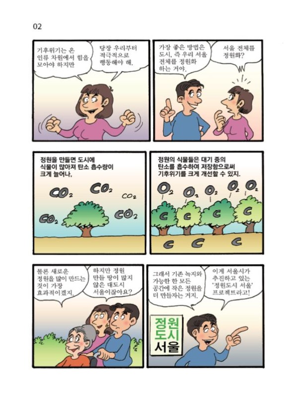 ‘먼나라 이웃나라’로 잘 알려진 이원복 작가와 협업해 제작한 『정원도시 서울 이야기』는 총 4장으로 구성되어 ▲도시 환경 문제와 정원도시 개념 ▲서울의 자연적 특성과 5분 정원의 삶의 질 향상 기능 ▲매력정원·동행정원 정책 세부 소개 ▲시민·기업·전문가가 함께 만드는 365일 식목일 메시지를 단계별로 풀어낸다.