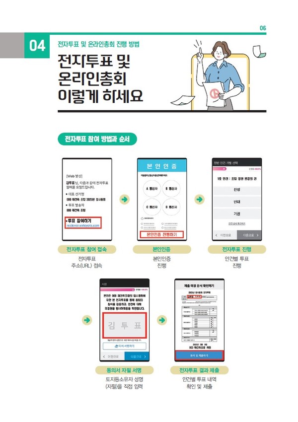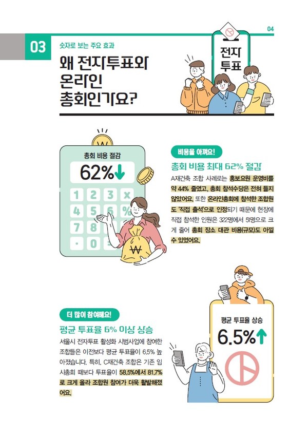 서울시는 전국 최초로 ‘정비사업 전자투표·온라인총회 활용 안내서’를 제작·배포해, 현장 실무자 및 고령층 등 디지털 취약계층도 쉽게 따라할 수 있는 가이드를 제공한다.