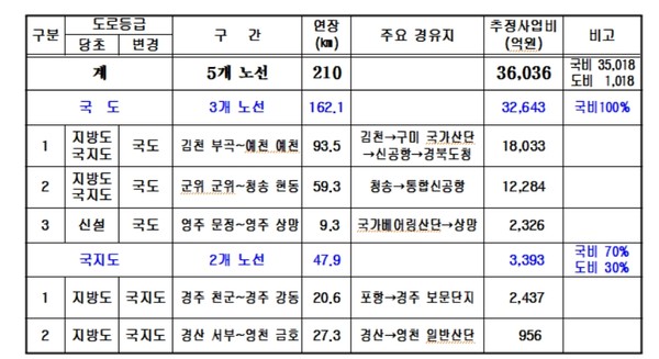 - 김천·구미에서 신공항·도청신도시 잇는 93.5㎞ 대로망 등 5개 노선 213.7㎞ 국도·국지도로 격상