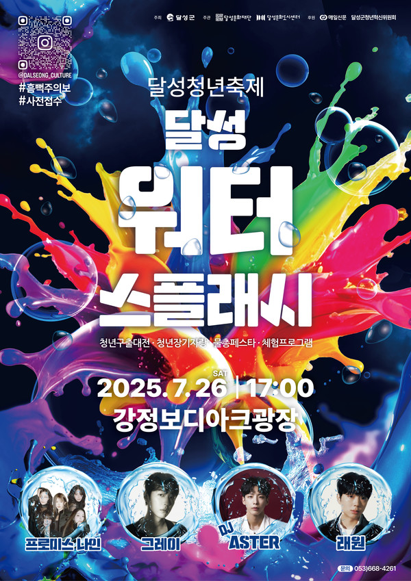 대구 달성군(군수 최재훈)과 달성문화재단 달성문화도시센터는 오는 7월 26일 강정보 디아크 광장에서 대구 지역 최초의 무료 워터 페스티벌 ‘달성 청년 워터스플래시’를 선보인다.