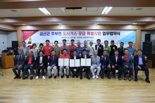 충남도와 금산군, 사업시행사인 제이비(JB) 주식회사는 협약에 따라 내년부터 2028년까지 총사업비 132억 원을 투입해 약 18㎞ 규모의 배관을 구축, 추부면 일대 1천 세대에 도시가스를 공급하기로 했다.