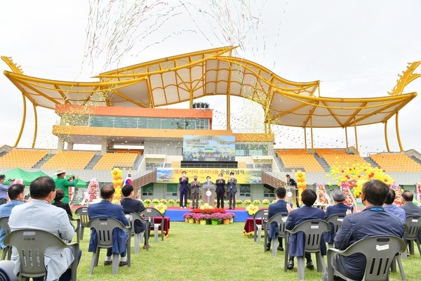 [한국지방정부신문=박상대 기자] 5만 장성군민의 숙원사업인 공설운동장 ‘옐로우시티 스타디움’이 드디어 준공됐다. 장성군은 15일 준공 기념식을 갖고, 옐로우시티 스타디움 개장을 공식 선포했다. 기념식에는 유두석 장성군수와 이개호 국회의원, 도‧군의회 의원, 기관장, 공사관계자 등이 참석했다.