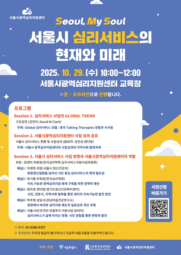 심포지엄에는 서울시민과 관계자, 학회 및 유관기관 전문가 약 150명이 온·오프라인으로 참석해, 성과 공유와 함께 ▴상담기관 모니터링 및 품질평가 ▴전문인력 양성 ▴재난·트라우마 대비 체계 구축 ▴상담기관 정보공개 등 구체적 실행 전략을 논의할 예정이다.