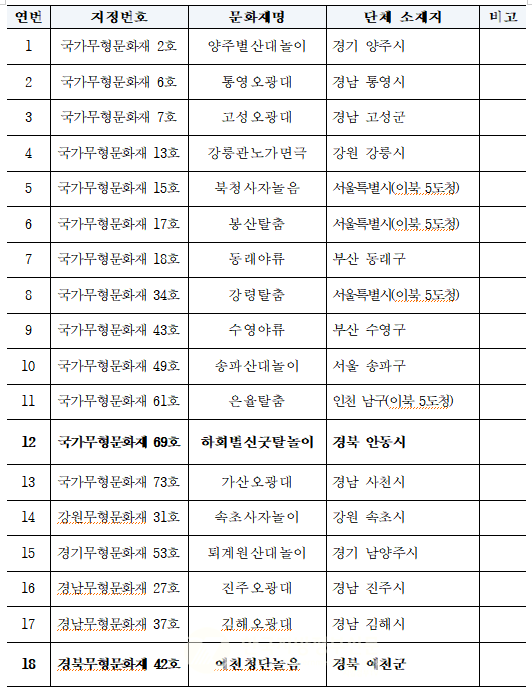 등재가 결정된 ‘한국의 탈춤’은 양주별산대놀이, 통영오광대, 고성오광대, 강릉관노가면극, 북청사자놀음, 봉산탈춤, 동래야류, 강령탈춤, 수영야류, 송파산대놀이, 은율탈춤, 하회별신굿탈놀이, 가산오광대 등 13개의 국가무형문화재와 속초사자놀이, 퇴계원산대놀이, 진주오광대, 김해오광대, 예천청단놀음 등 5개의 시ㆍ도무형문화재로 구성된 총 18개의 탈춤 종목이다.